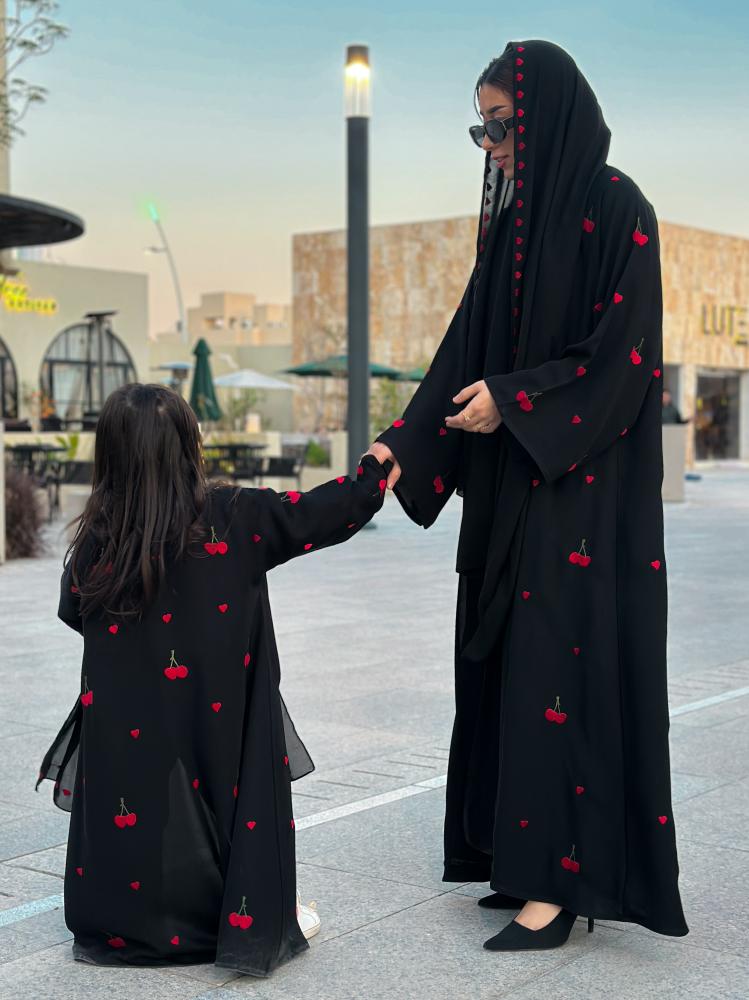 - عباية سوداء بقماش انترنت بتطريز الكرز و قلوب